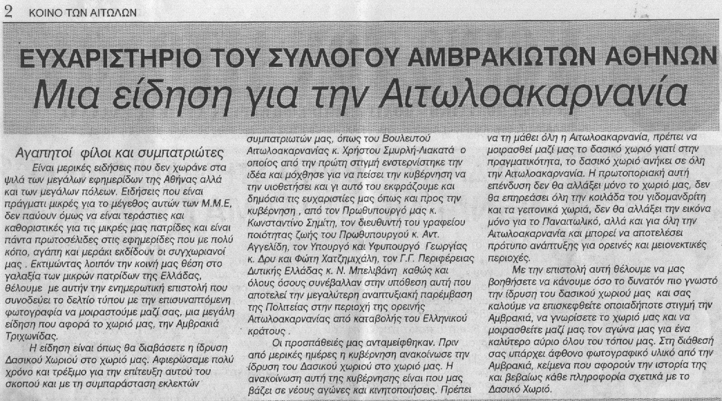 Η εφημερίδα Κοινό των ΑιτωλώνΤον Ιούνιο του 2003 σε τετρασέλιδο αφιέρωμα για το Δασικό Χωριό Σελίδα 2
